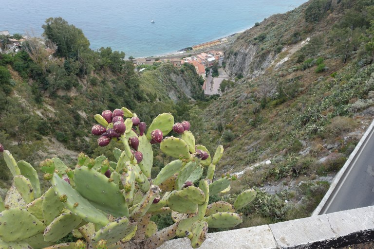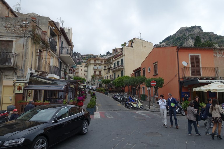 Extra-knäcker Sciliens pensionärer som taxi-chaufförer? Dagens skjuts upp till Taormina fick vi av en gubbe som var så gammal att det var osäkert om han skulle klara sig hela vägen upp? Han valde en annan väg än den vi åkte förra gången – en riktig serpentinväg med 180 graders hårnålskurvor som var både vacker och spännande! Gubben körde så långsamt att vid varje krök var vi rädda att bilen skulle börja rasa bakåt och nedåt igen! Fram kom vi i alla fall och han var snäll och gullig då han ville bjuda på karameller som han själv satt och snaskade på hela vägen. 😊
