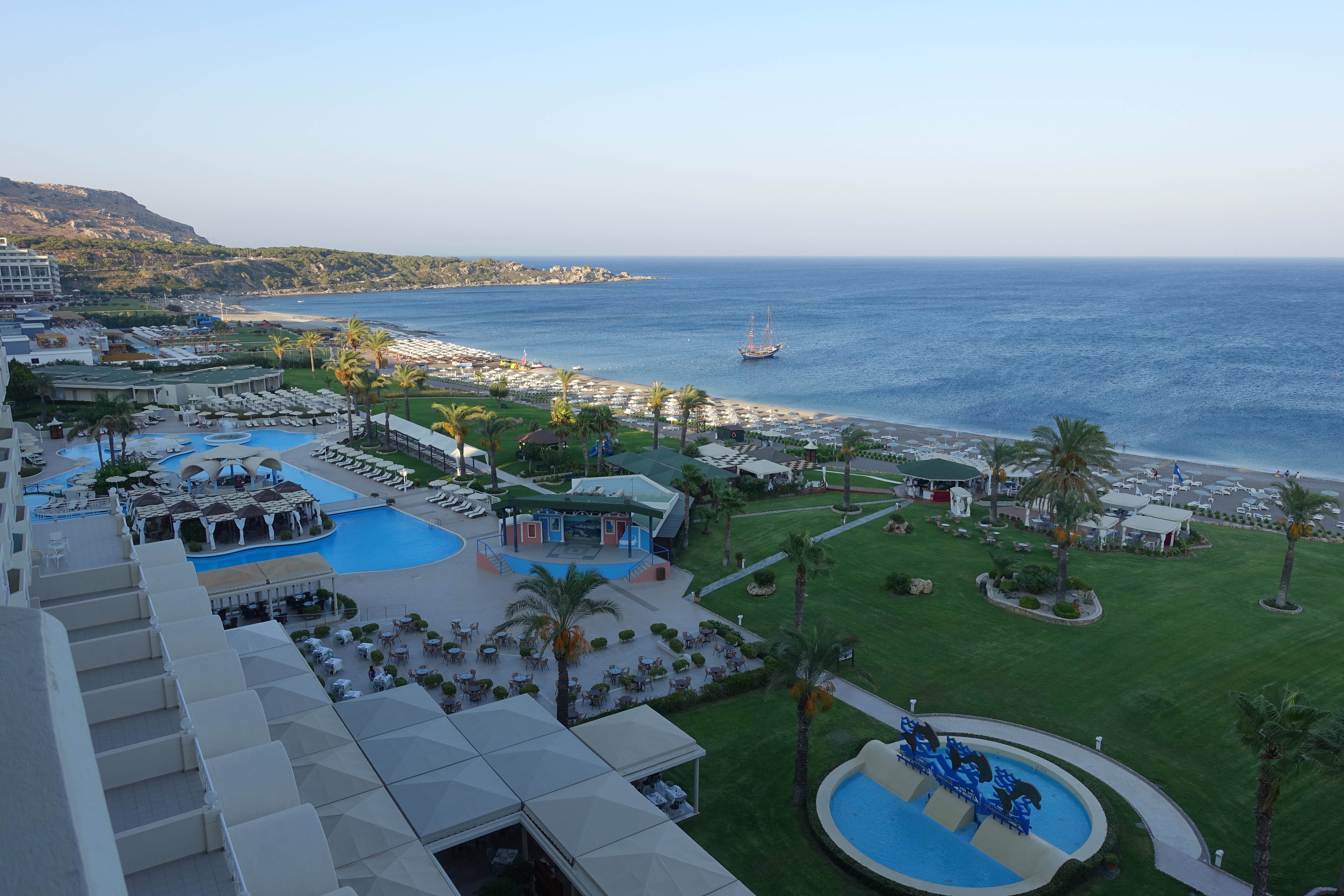 Vårt hotell ”Palladium” hade ett fantastiskt läge med egen strand och solstolarna ingick i priset. Pluspoäng! Även hotell-frukosten får klart godkännt, sällan man får en bättre sådan!
