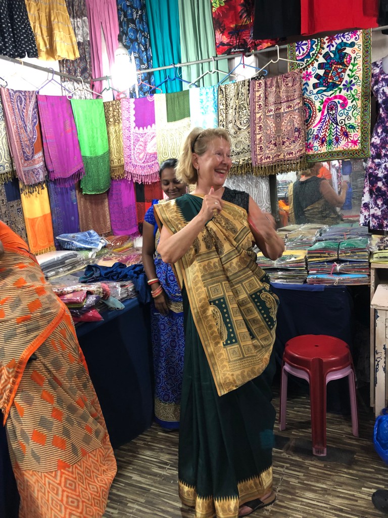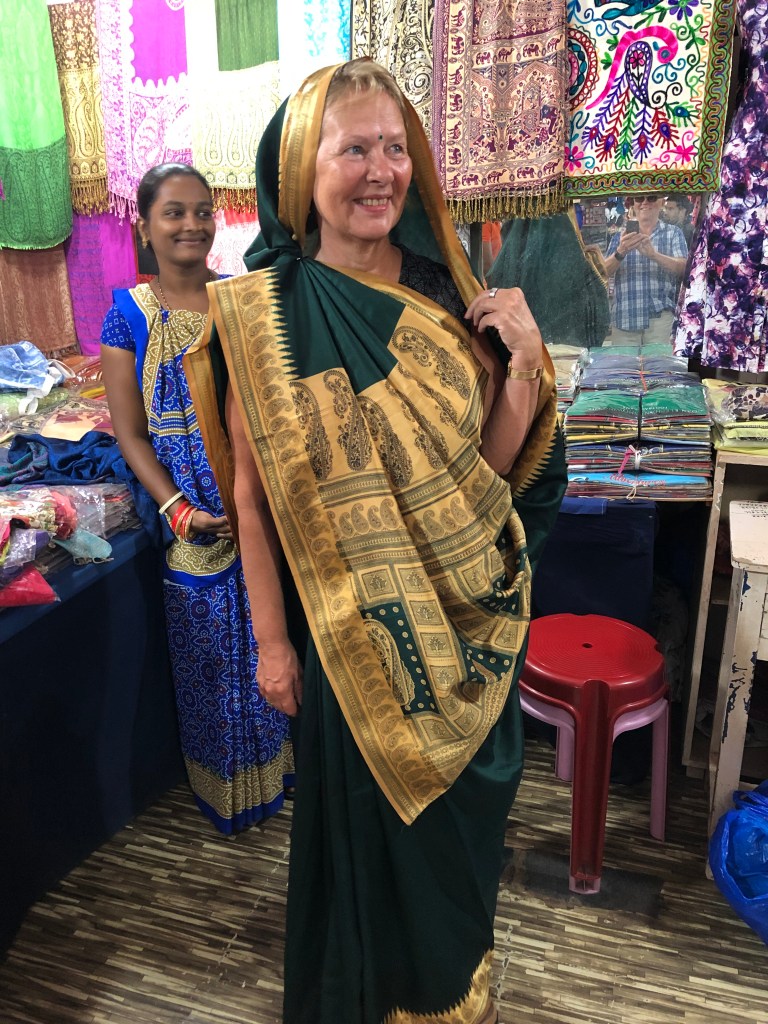 Plötsligt stod man där och provade sari – ett märkligt plagg! Flera meter tyg som arrangeras, viks och veckas runt ens kropp utan nålar, knappar eller något annat som håller ihop plagget. Sitter stadigt och bra ändå!